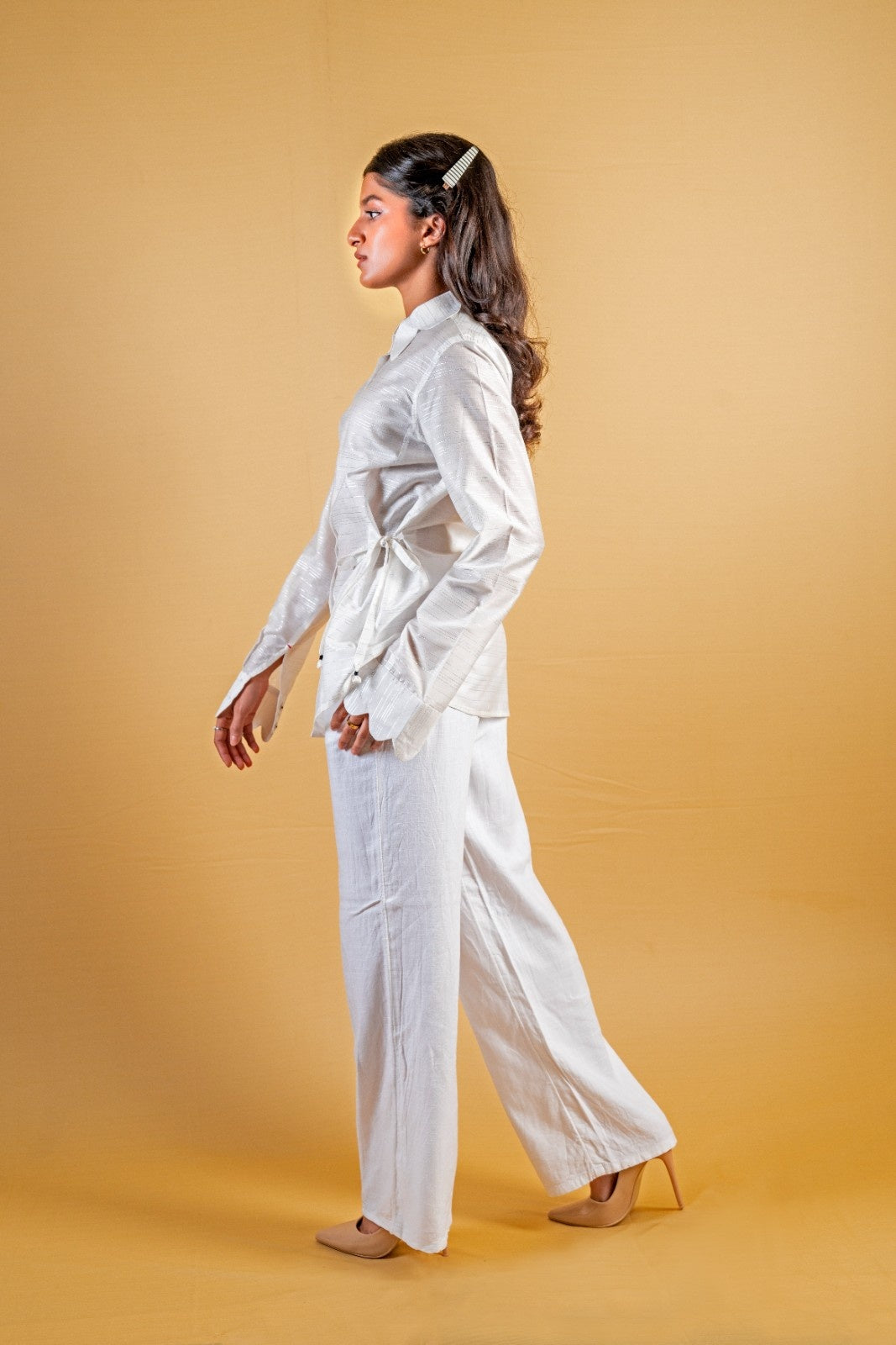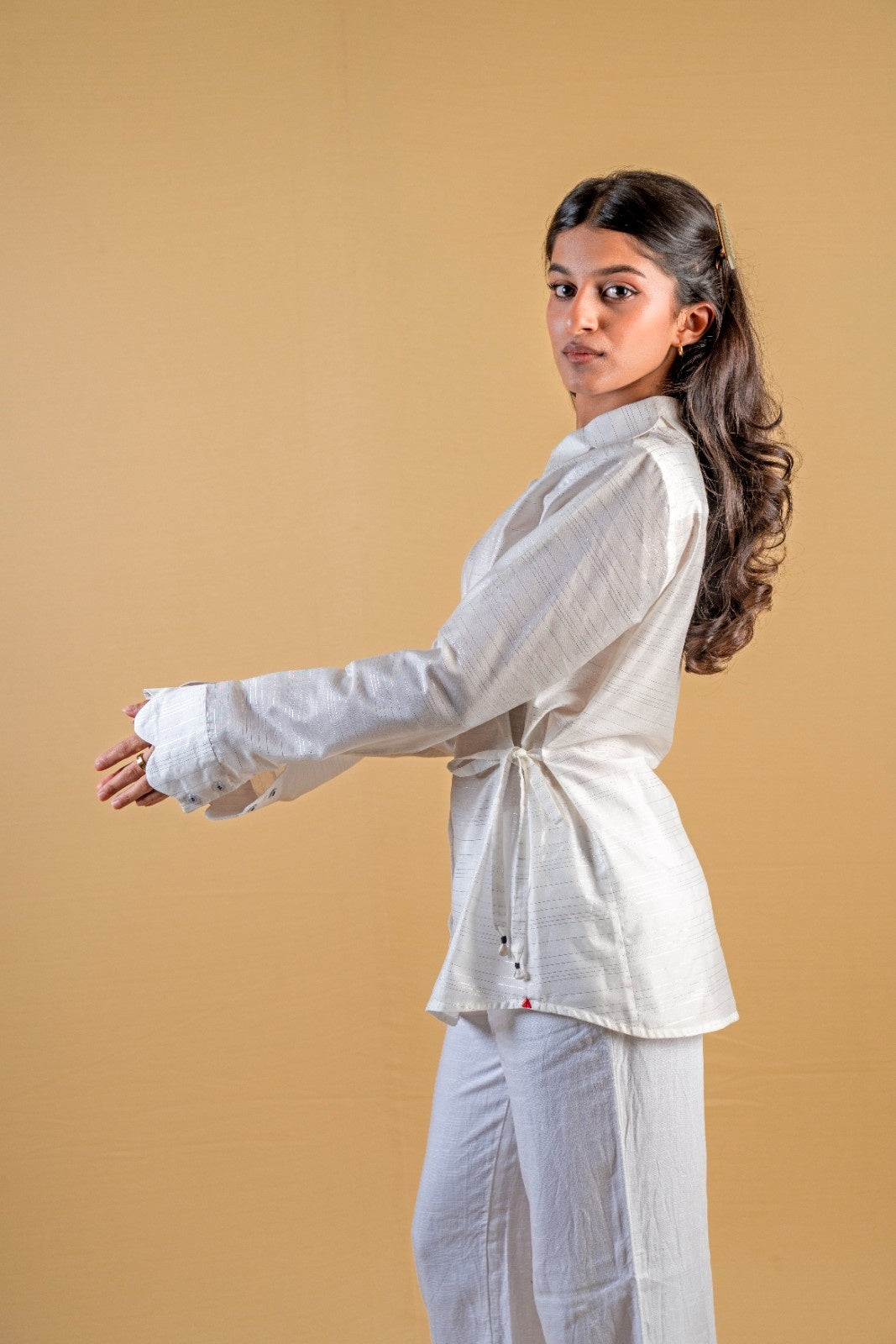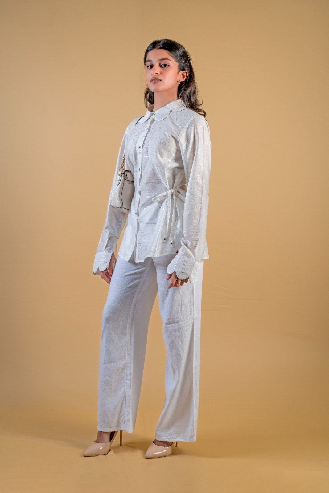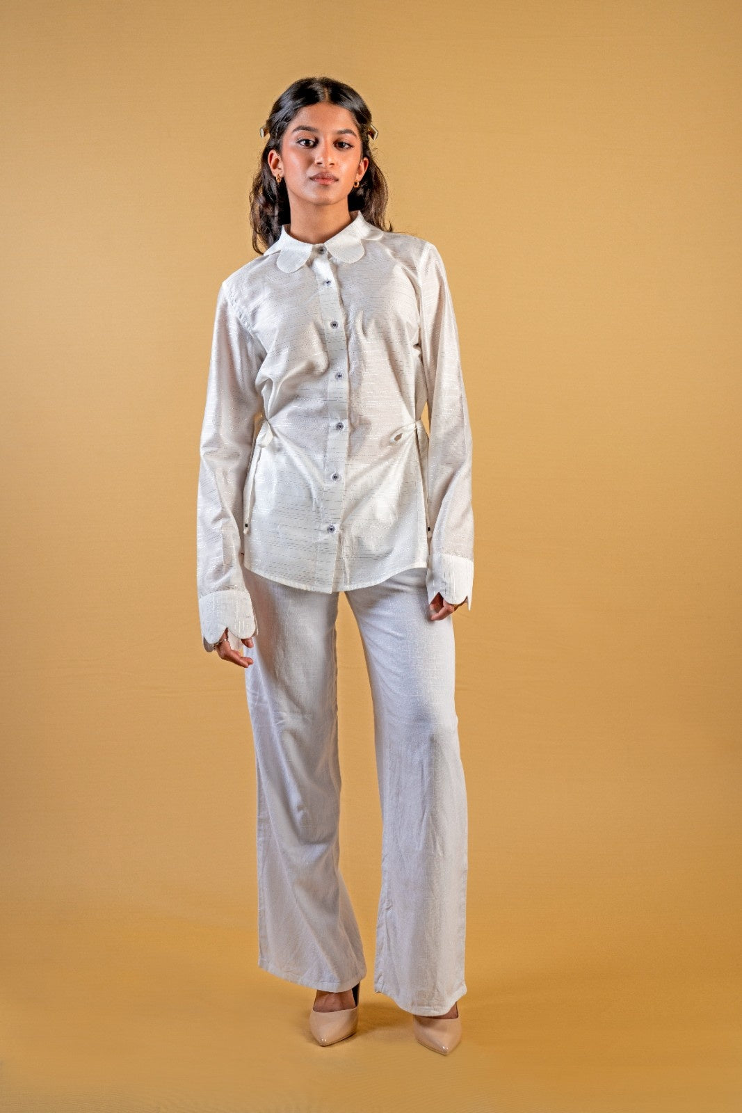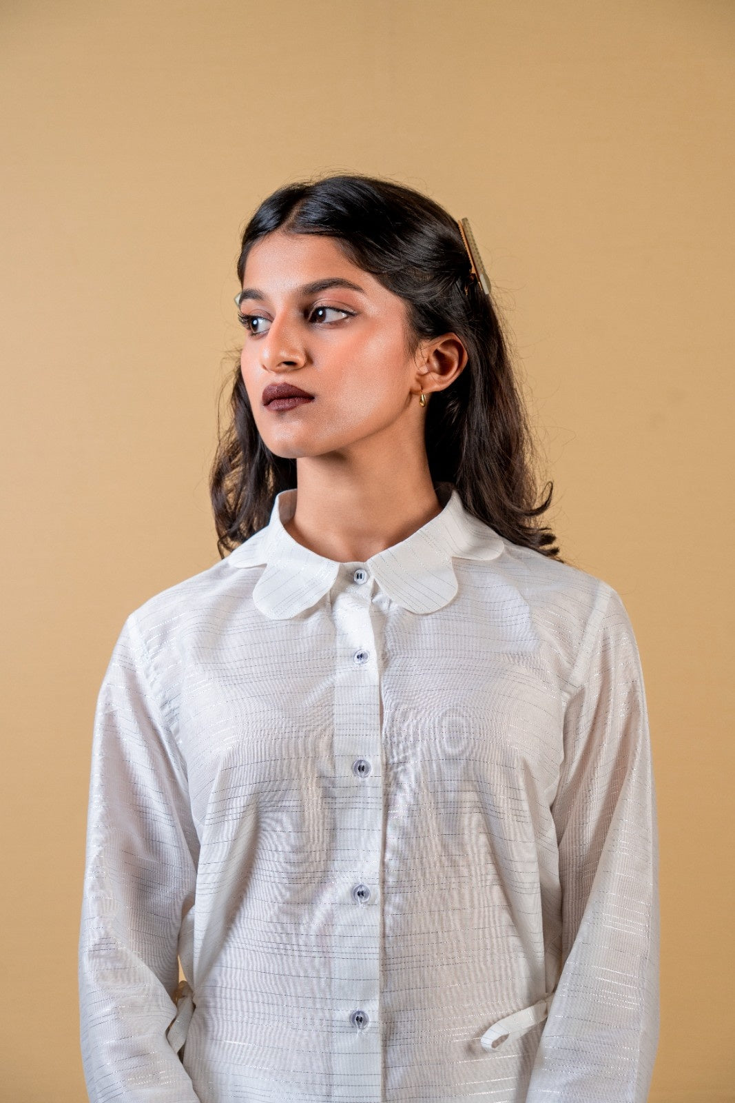 Design Details: •Frostina has a graceful and playful charm •Features a floral collar & matching cuffs add to the elegant look •Fine black thread detailing on buttons and side strings •Side strings can be tied for a fitted look or left loose for a relaxed fit •Finished with an apple-cut hem for a stylish touch •Combines comfort with subtle elegan