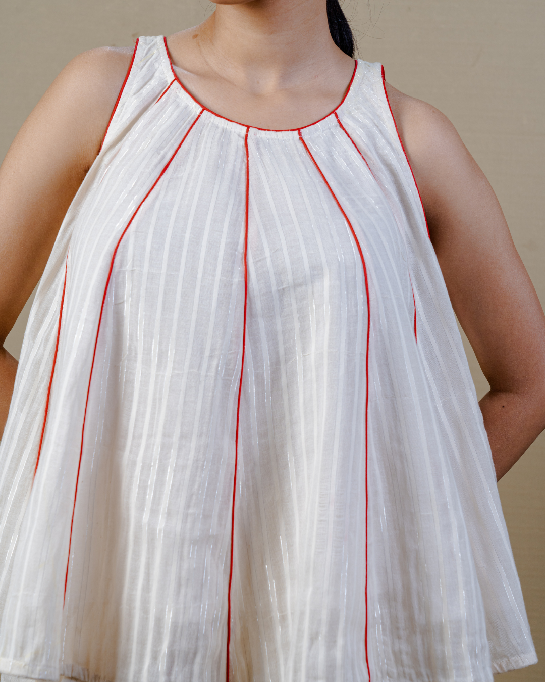 • Armholes neatly outlined with piping, complementing the sleeveless