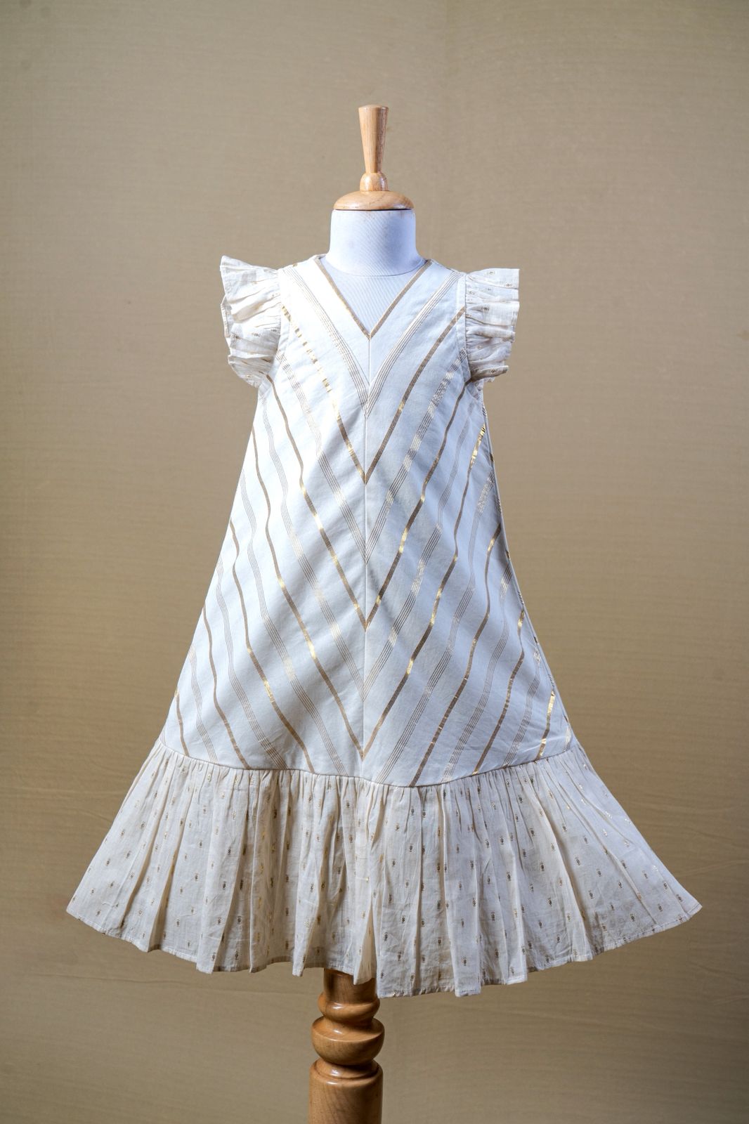 Design Details : • Graceful front V-neckline • Back neck with belts forming knot. • Sleeveless with soft frill detailing for cap-sleeve charm • Contrasting above-knee gather adds texture and playful structure • Linear fabric forms subtle V patterns, adding depth and style • Fully lined