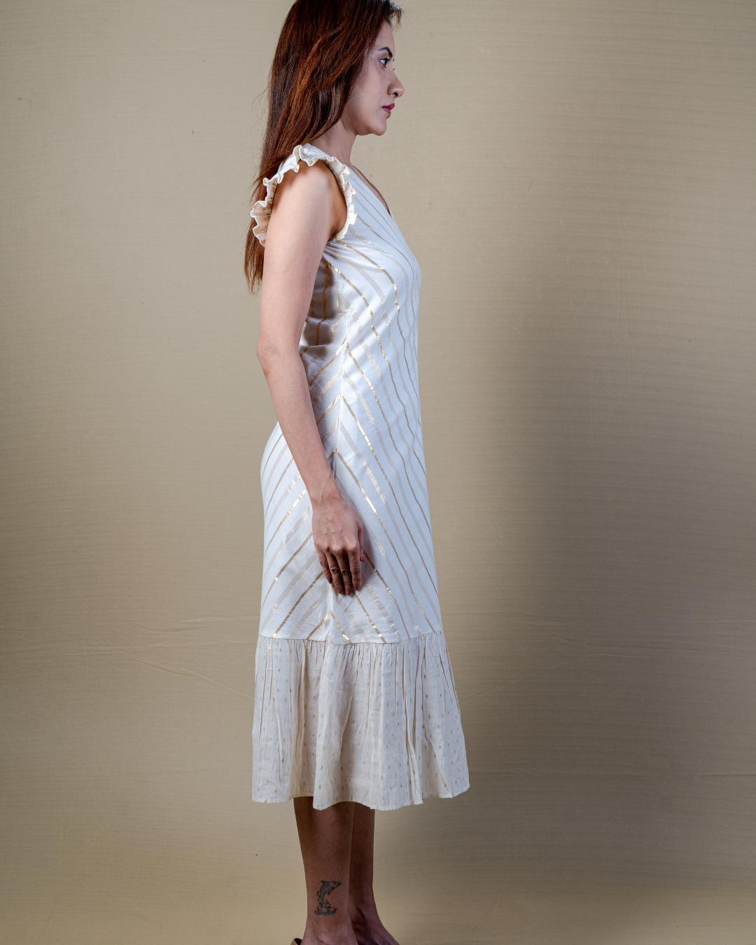 Design Details : • Graceful front V-neckline • Back pack-neck for clean structure • Sleeveless with soft frill detailing • Contrasting above-knee gather adds texture . • Linear fabric forms subtle V patterns, adding depth. • Lined Till knee Length