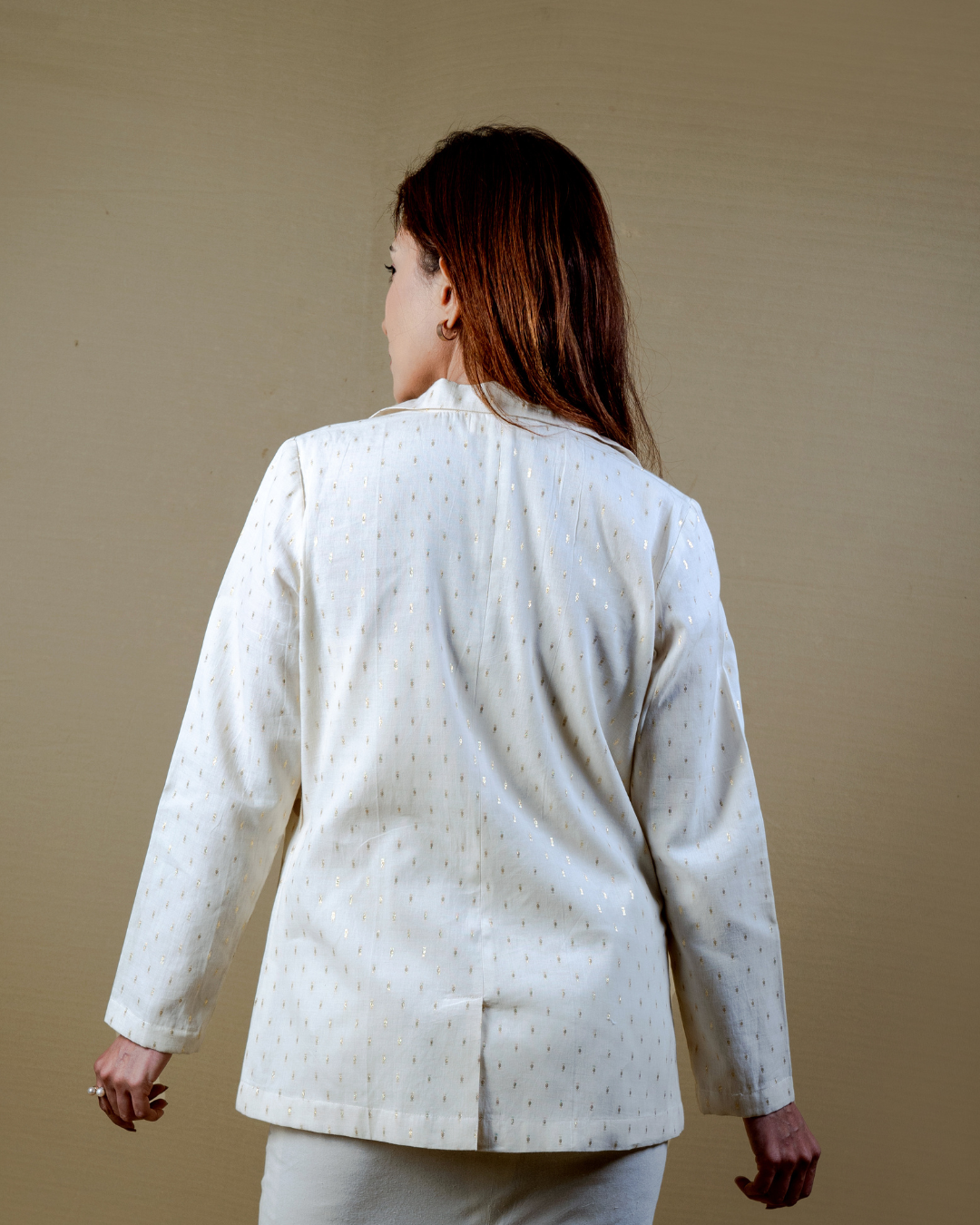 Design Details : • Notched lapel blazer collar for a sharp look • Full sleeves for added coverage • Back down slit for easy movements • Unique fabric detail at the collar, creating an elegant outward fold • Comes with detachable belt for a structured fit • Fully Lined